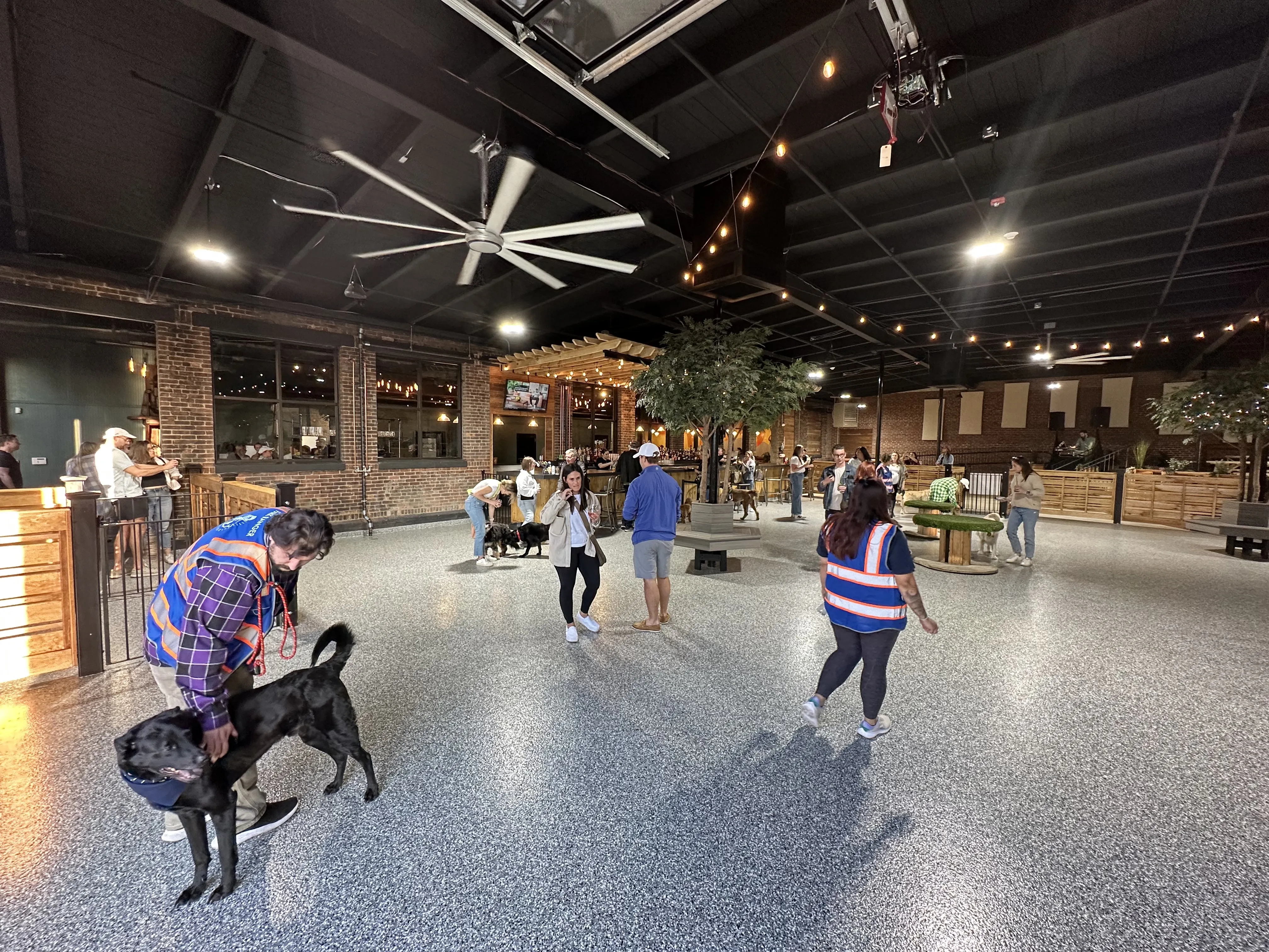 TVs aired sports games, and the long full-service bar was a great place to unwind while keeping an eye on our furballs. Even better, the attached outdoor space allowed for seamless indoor-outdoor off-leash play, giving dogs even more freedom to explore.